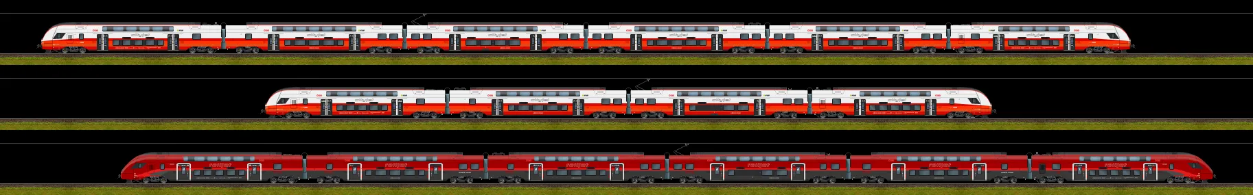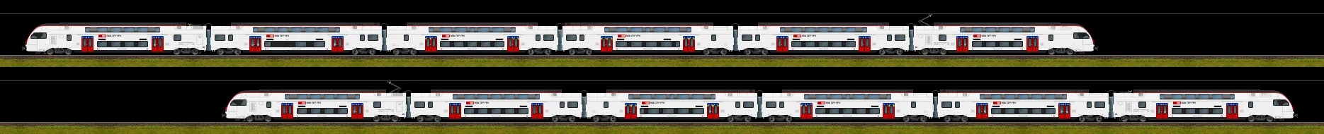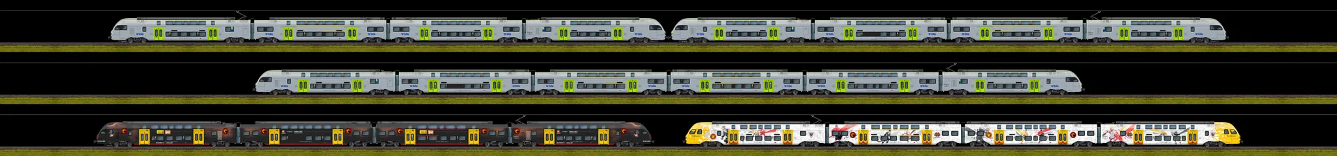 In den letzten Wochen ist mal wieder ein neues Fahrzeug entstanden - der Stadler KISS. Aktuell in der Versionen der BLS (RABe 515 MUTZ) und SBB (RABe 512 IR-Dosto). Entstanden sind bei der BLS auch die beiden Eishockey-Werbezüge. Im Download mit den PNG-Dateien sind zudem alle getauften Steuerwagen dabei. Ebenfalls bei der SBB-Version. Als BMP-Datei sind jeweils nur die ganzen Züge vorhanden, ohne Wappen-Varianten. Diese müssen bei Bedarf selber zusammengebastelt werden.